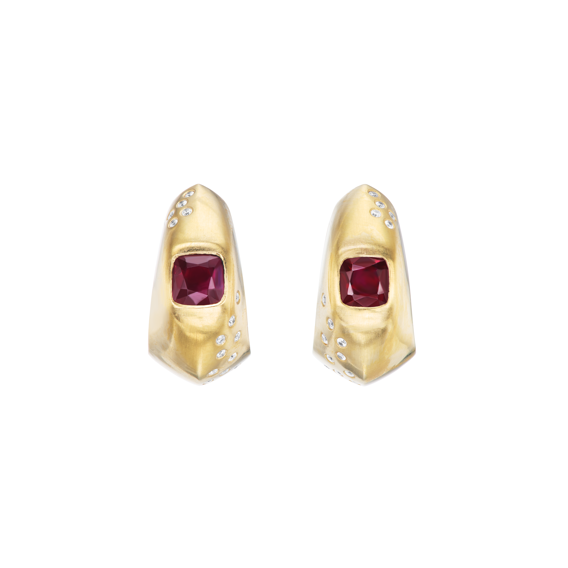 Rubies 1.87cts, diamonds .26cts, set in 18k yellow gold. Earrings measure 19x11mm. Handmade in New York.